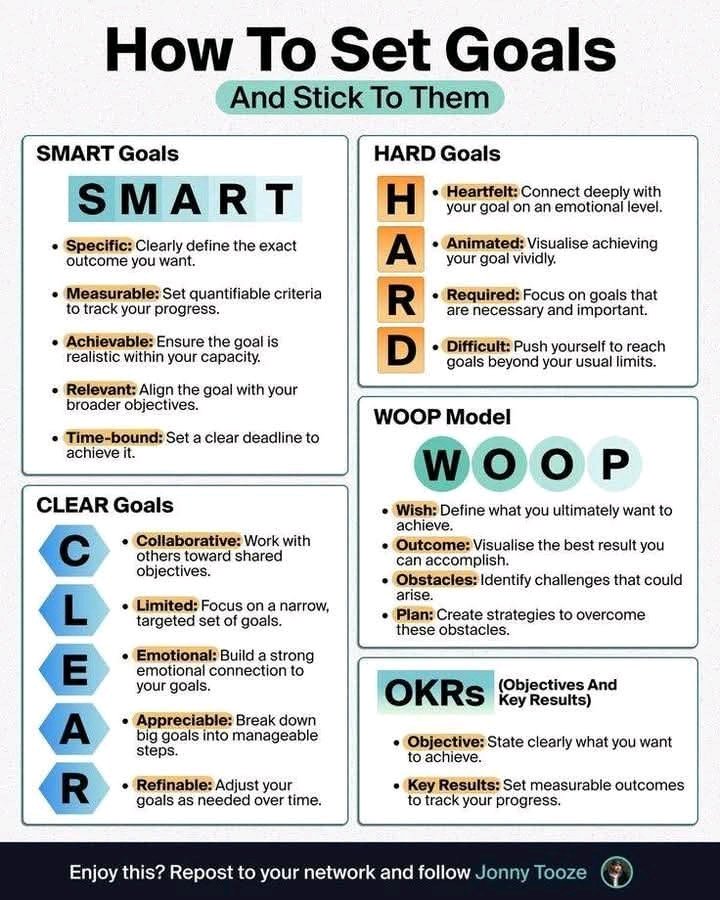 Hey!How to set goalsBefore we begin: If you enjoy this newsletter, please forward it along. If someone forwarded this to you, click here to sign up https://www.100goalsclub.com/life-goals-club-membership.html 100 Goals Club is a complimentary newsletter that specializes in helping you plan your life goals in 10 important areas. 1. Personal Development 2. Health and Fitness 3. Family and Friends 4. Hobbies and Passions 5. Financial 6. Career 7. Adventure 8. Travel 9. Lifestyle 10. Leaving a Legacy / Giving Back You are part of an exclusive group of goal achievers! This email is going out to 2,009 email subscribers. You are receiving this email because you expressed an interest in life goals and receiving the Goal Setting Worksheet. Click here to order my accompanying 100 Life Goals Book > https://www.amazon.com/dp/1727154452 Remove your email by clicking unsubscribe below at any time. Hey Goal-Getters! This newsletter will focus on how to set goals. I am a regular reader and scroller on the "X" platform (formerly twitter). Almost daily, I come across great graphics created by people on topics that relate to the 100 Goals Club. This newsletter was inspired by an "X" post by Jonny Tooze on how to set goals. Tony is an entrepreneur, strategist, and architect of modern businesses. He build's and advises companies that work smarter — using clarity, systems, and technology to create real, sustainable growth. Over the past twenty-five years, he has launched, scaled, and chaired creative and technology businesses — from independent agencies to AI-driven ventures. Today his focus is on helping founders and leadership teams simplify growth, make sharper decisions, and design businesses that give them freedom, not friction.