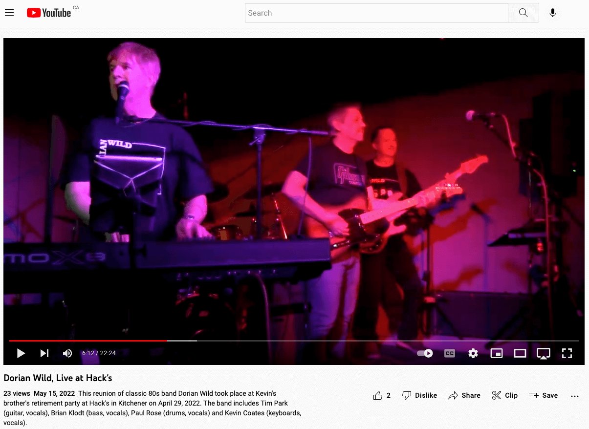 My music passion!My 80's band Dorian Wild recently performed a gig at a club in Kitchener Ontario. I am the Bass Guitar player and back up vocalist. It was a special performance for our keyboard players brothers retirement party, retiring from a successful 25+ year career as an elementary school teacher / vice principle / principle. The band only plays together about once every 2-3 years for special occasions. Playing music is one of my hobbies and passions!Check out the YouTube video with a 20 minute compilation of about 10 classic rock songs. https://www.youtube.com/watch?v=tyjqq7ycCDc